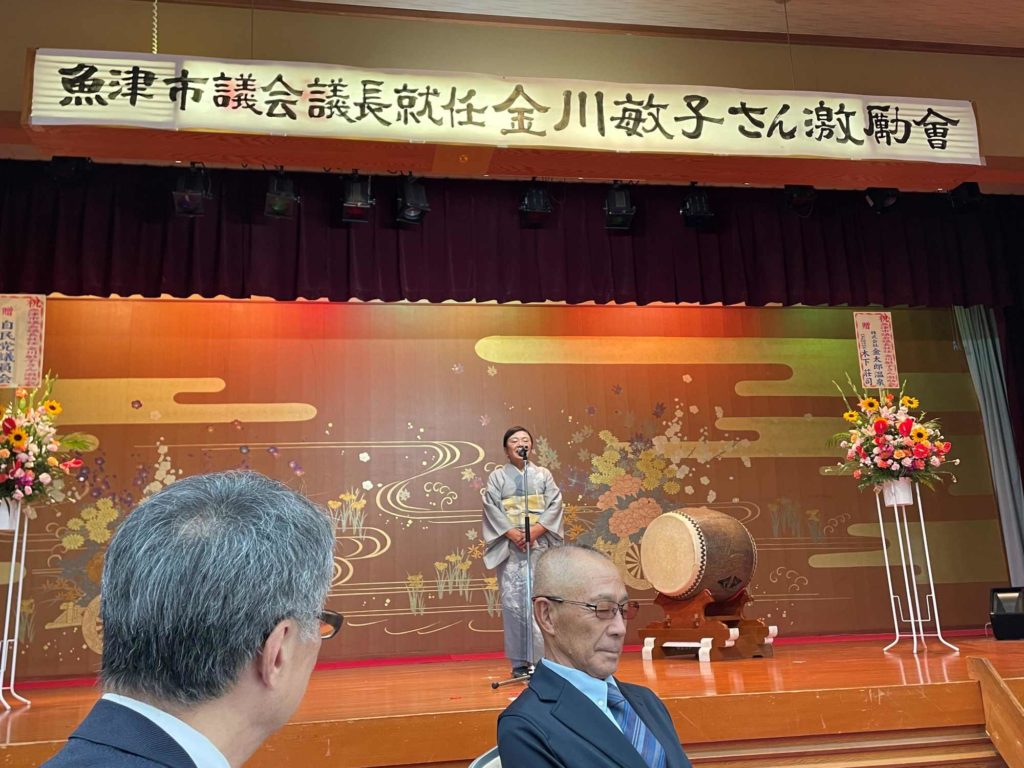金川 敏子魚津市議会議長の就任激励会。「魚津」は呼んで字の如く、「魚」の街であり、「米」だけでなく、「果樹」、「花き」の農業の街であり、近年観光政策にも力を入ている新川地域の中心地である。解決すべき課題も沢山あるが、オール魚津で進むのみ!