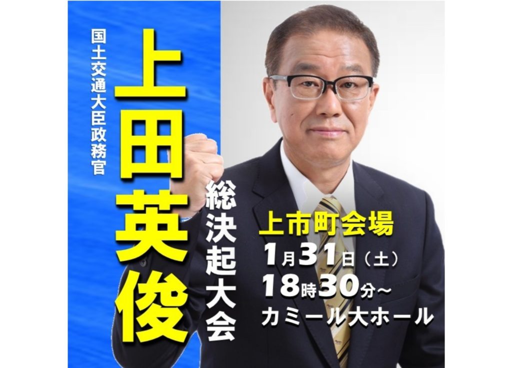 「1月31日の総決起大会」2026 1.31 2026年1月31日 2026年1月31日 「1月31日の総決起大会」 本日は 18:30より、上市町「カミール大ホール」 にお伺いします。 ぜひ会場に足を運んでいただき、上田英俊の想いを直接お聴きいただければ幸いです。雪の中お越しくださる皆さまには、どうか無理のない範囲でご参加ください。 ご来場の際は、運転やお足元にくれぐれもお気をつけてお越しください。